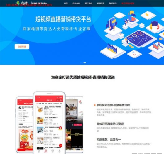 织梦最新内核开发的模板,该模板属于企业通用、短视频、直播带货、营销品台类企业使用,一款适用性很强的模板,基本可以适合各行业的企业网站!响应式自适应各种移动设备,同一个后台,数据即时同步,简单适用!原创设计、手工书写DIV CSS,完美兼容IE7 、Firefox、Chrome、360浏览器等;主流浏览器;页面简洁简单,容易管理,DEDE内核都可以使用;附带测试数据! 模板特点: 1:织梦自适应产品模板,代码简洁,风格大气高端,页面干净。 2:首页带新闻展示,服务介绍,案例展示等。 5:采用现在流行的HTML5框架,兼容主流的浏览器,响应式,自适应,完美支持移动设备 6:整站界面设计大气,展现出你的实力。 7:后台直接修改联系方式、地址、版权信息,网站内容等,修改更加方便。使用程序:织梦DedeCMS版本都可以使用。模板页面:index.htm 首页模板head.htmfooter.htmarticle_article.htm 文章内容 这里不一一列出!温馨提示:按照正常的织梦安装步骤来安装还原就可以用了,从后台重新点击保存下系统基本参数。 系统>系统基本参数> 保存(确定)。