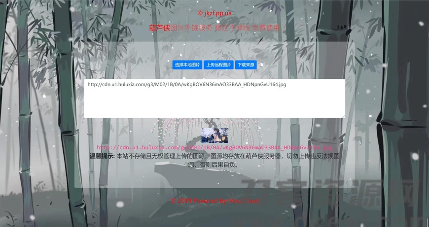 葫芦侠图片外链服务 稳定不掉线 免费使用 温馨提示: 本源码不存储且无权管理上传的图源,图源均存放在葫芦侠服务器,切勿上传违反法规图源,否则后果自负。