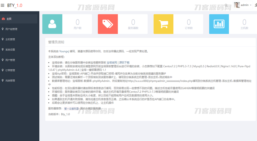 Bty分销系统开源版,宝塔分销系统开源版,该系统基于宝塔开放API底层控制器,进行主机控制,目前可以完成大部分主机操作功能如:新增主机、修改主机配置、删除主机、查找主机、以及宝塔面板能开放使用的主机操作功能,由于宝塔面板的单一用户性,所以开发这款可以由个人操作的IDC分销系统。项目特色:独立的用户管理、后台配置使用宝塔API接入服务器可实现正常的网站操作,实现网站开通、域名绑定、SSL证书、防盗链、一键部署、网站防篡改、网站监控报表、防火墙等功能配合宝塔强大的生态系统,安装更多插件后可使用到许多有趣的功能内置易支付,简单方便完成会员充值操作软件架构 thinkphp5flatlab-bootstrap3 环境需求 Centos7.2PHP5.3-7.3Mysql5.5Redis4.0.9Nginx1.14.0Pure-Ftpd 1.0.47phpMyAdmin 4.4 安装教程1.上传并解压源码到网站根目录(暂不支持二级目录)2.修改application/database.php中数据库信息3.上传并导入数据库文件dkewl.sql4.将运行目录设置为/public5.添加thinkphp伪静态规则(规则已打包)6.登陆后台:http://你的域名/admin/login.html 7.后台账号:admin 密码:admin000