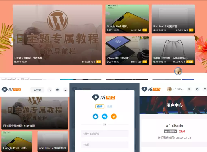 最近仿RiPro主题,发现缺少重要文件,于是从网上花了十个大洋来参考,官方正版价格相对昂贵。 RiPro主题的模板可供所有人使用。 主题将继续为每个人更新,请放心使用! RiPro主题最新功能特色: 美化下载错误提示 超出次数错误页面提示 修复普通用户在个人中心绑定第三方登录时返回页面报错问题不跳转回用户中心页面 修复个人中心充值成功后无法自动刷新页面问题 修复在wp后台发布文章时时间戳差8个小时问题 加快优化夜间模式切换速度 无需转圈圈 修复文章列表模式下,标题超过三行时出现溢出问题,自适应手机端 新增微信公众号登录-主题设置-登录注册-公众号登录 6.3+,具体配置教程在ripro演示站有文章 公众号登录在PC端的时候,用后点击登陆按钮,弹出关注二维码,用户关注后自动登录 新增公众号好登录后发送一条自动回复的消息,比如欢迎您登录本站,之类的提示 新增如果用户在微信内打开网页,设置过公众号登录的网站可以直接正在登录的时候跳转登陆,唤醒微信内组件 新增公众号搜索功能,用户在公众号内发送关键词,可以自动返回网站相关的文章和链接,类似微信机器人 新增微信的JSAPI支付模式,在微信内打开的用户,并且已经通过微信登陆了账号,在购买或者充值的时候直接唤醒微信支付 新增全新缓存技术,底层代码大量进行缓存初始化,配合WordPress的object-cache.php技术实现opcache和mencached缓存加速,最高优化到首页只有2个SQL查询,利用子主题可以改写缩略图代码配合阿里云oss技术速度得到极致提升 请注意缓存技术必须是自己服务器满足加速条件,可以配合WPJAM插件使用,要达到首页1~2次级别优化,请自己根据自己的网站情况修改源代码折腾 改写优化footer全站底部备案号地址为:http://www.beian.miit.gov.cn,避免检查时打不开工信部网站 优化改写首页弹窗延迟弹出,用户第一次打开网站时,不会马上弹出网站公告弹窗,延迟3秒后弹出,提高用户体验 升级注意事项:为了保证你无痛升级,请在升级之前备份好自己的旧版本主题! 升级注意事项:上传主题包时候,建议在宝塔后台文件管理上传解压覆盖,可以把旧版主题文件目录重命名(ripro-back),直接解压新版本压缩包! 升级注意事项:上传完毕主题后,请及时删除自己上传zip压缩包,防止被坏人恶意扫描下载,如因自己大意泄露主题包严重者封号处理! 升级注意事项:如果上传新版本后显示错误,请删除主题目录,重新上传解压,解压文件夹权限是否都和其他目录保持一致,重启php即可! 升级注意事项:自己美化,修改过的,不要问为什么这里不显示那里不显示,请勿打扰,作者不涉及任何美化修改。 (重要)伪静态设置: 主题启用后,请设置WordPress的固定链接和伪静态规则,否则个别页面会出现404错误 1:宝塔面板请在网站管理–设置–伪静态–选择wordpress–保存 2:然后到WP后台设置–固定链接–固定连接模式推荐为自定义:/%post_id%.html 非宝塔面板用户,请自己百度看一下自己服务器环境如何配置WP网站的伪静态,步骤二同上 已经配置过自己伪静态规则的用户请忽略本设置,固定链接模式只要是自定义模式都OK 特别申明 伪静态一定要按照上面的要求配置好,不然你有些页面进不去的话别来咨询我问为什么?这个怎么弄?是不是你搞错了什么的!!! 以下为日主题7.0介绍: WordPress主题RiProV7.0主题最新破解去授权无限制版本 源码说明: Version V7.0.0 2020-06-07 应会员要求 在文章内页新增显示meta瞄点,利于seo, 分别显示作者 头像 昵称 发布时间日期瞄点 所属分类 多个 大面积优化文章内页文字图片等排版,包括图片,相册,h 1234标题 行高 字体大小等, 包括手机端协调 主题设置 底部设置 新增 是否开启底部友情链接模块 ,开启后可以在底部显示友情链接, 添加方式在wp后台 链接 添加,跳转模式为新窗口打开 新增底部设置 网站公安备案号,修复备案链接www问题, 正确指向工信部网站链接,并给链接增加rel=”noreferrer nofollow”瞄点 防止seo权重流出 原版未美化懒人升级:直接和以往一样 上传主题包解压覆盖删除压缩包,重启php即可! 子主题美化注意: 本次更新付费开通会员逻辑有变化,包括前端页面和js文件,请美化的用户注意,在其他老司机没有适配更新美化页面的时候,切勿盲目升级,会出现js等不兼容情况 升级注意事项:为了保证你无痛升级,请在升级之前备份好自己的旧版本主题! 升级注意事项:上传主题包时候,建议在宝塔后台文件管理上传解压覆盖,可以把旧版主题文件目录重命名(ripro-back),直接解压新版本压缩包! 升级注意事项:上传完毕主题后,请及时删除自己上传zip压缩包,防止被坏人恶意扫描下载,如因自己大意泄露主题包严重者封号处理! 升级注意事项:如果上传新版本后显示错误,请删除主题目录,重新上传解压,解压文件夹权限是否都和其他目录保持一致,重启php即可! 升级注意事项:自己美化,修改过的,不要问为什么这里不显示那里不显示,请勿打扰,作者不涉及任何美化修改! 伪静态设置:(重要) 主题启用后,请设置WordPress的固定链接和伪静态规则,否则个别页面会出现404错误 1:宝塔面板请在网站管理–设置–伪静态–选择wordpress–保存 2:然后到WP后台设置–固定链接–固定连接模式推荐为自定义:/%post_id%.html 非宝塔面板用户,请自己百度看一下自己服务器环境如何配置WP网站的伪静态,步骤二同上 已经配置过自己伪静态规则的用户