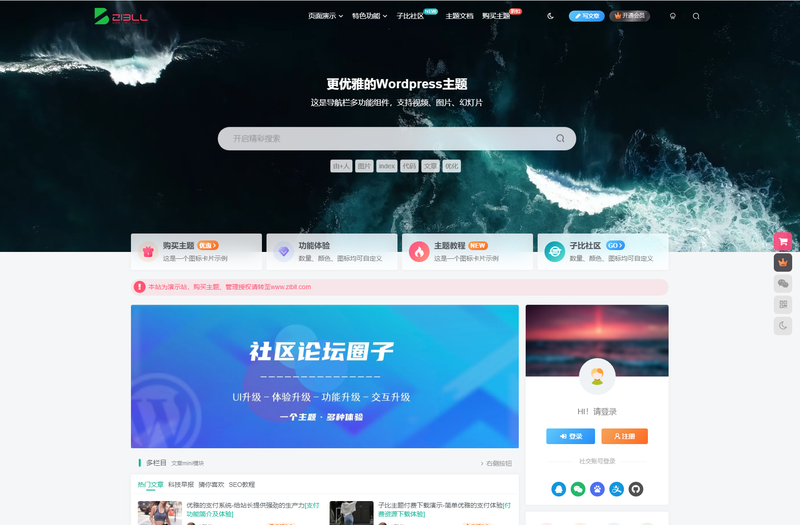 最新Zibll子比主题v7.8绕授权开心版+美化插件+弹窗插件 绕授权版本,所有的功能和正版一模一样,附带了美化插件和弹窗插件,第三方聚合登录新增抖音登录,详细的搭建教程都已配套。 更新日志: v7.8新功能 新增自动检测用户浏览器性能情况,在性能较差的设备上将自动做性能优化处理(关闭高斯模糊特效,减少动画等),以提供更流畅的体验 新增付费下载连接自动识别 123 网盘、阿里云盘、迅雷网盘、夸克网盘、360 云盘的链接显示名称及图标 新增付费下载粘贴云盘生成的分享链接时,自动识别并填写链接及提取码 新增图片灯箱鼠标滚轮切换的功能,优化了灯箱切换动画效果 新增公众号搜索内容自动回复排除文章或帖子的功能 新增视频播放器倍速播放的功能 新增文章、帖子评论置顶功能,以及对应权限的权限管理 新增每个月自动清理一次未支付的无效订单 新增设置网站全局背景图功能