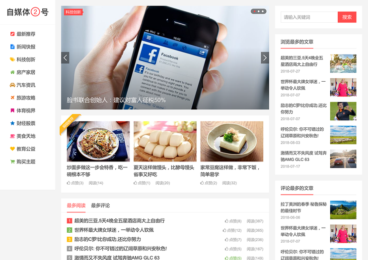 自媒体二号是一款WordPress主题,主题采用三栏设计布局,左侧导航栏可添加彩色小图标,具有强烈的视觉冲击效果。首页内容可展示幻灯片置顶文章、阅读/评论排行等精妙设计的内容模块,对网站用户具有极大吸引力。主题还配备了强大的后台控制面板,您无需触碰任何代码,轻点鼠标即可完成对主题、网站的各种细节和功能设置。 自媒体二号主题特色 自适应设计(完美兼容电脑、平板,手机浏览) 强大的主题设置面板(查看演示) 漂亮左侧导航栏 三级子菜单支持 首页幻灯片展示置顶文章 首页展示文章阅读排行和评论排行 文章列表自动获取3张缩略图展示文章内置相册 缩略图(特色图片)自动裁剪功能 专属自定义小工具(广告,带缩略图的最新文章、随机文章、浏览最多的文章、评论最多的文章等。) 文章页支持WordPress相册幻灯片展示 文章页支持百度分享 文章页支持点赞功能 文章页支持打赏作者功能 文章页展示相关文章 文章页展示热门文章 文章页展示作者说明 侧边栏广告显示功能 完美兼容IE9+、Chrome、Firefox、Safari、360等主流浏览器,针对mac OS等Retina屏幕优化显示 100% WordPress代码标准验证通过 100% W3C验证通过 主题完全开源,无任何隐藏代码,零广告,零风险 下载解压主题,将文件上传至WordPress主题目录/wp-content/themes或者在后台中上传主题,然后启用主题即可。