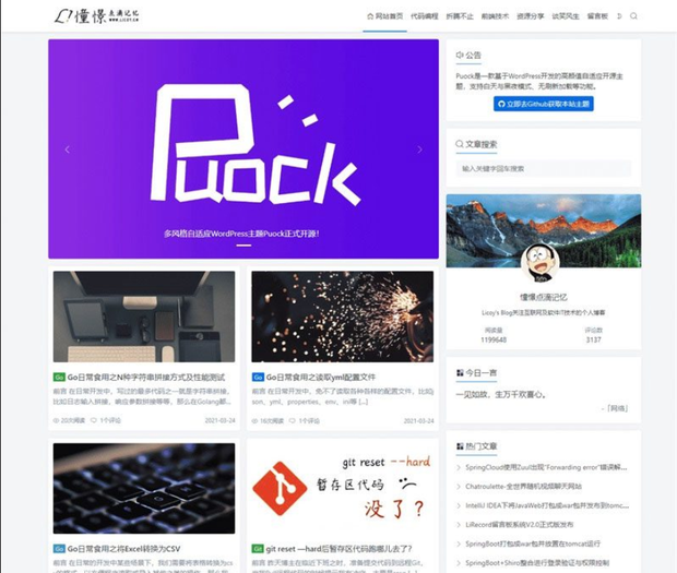 一款基于WordPress开发的高颜值的自适应主题,支持白天与黑夜模式。 安装:请到 发行版本 中进行下载最新版本,然后到WordPress管理后台中的「外观」-「主题」中点击「添加」,选择Puock的主题包进行上传安装并启用即可。 提示:为了防止主题不兼容,请在安装主题前进行数据备份,防止数据字段重复覆盖等情况发生。 主题特性: 支持白天与暗黑模式 全局无刷新加载 支持博客与CMS布局 内置WP优化策略 一键全站变灰 网页压缩成一行 后台防恶意登录 内置出色的SEO功能 评论Ajax加载 文章点赞、打赏 支持Twemoji集成 支持QQ登录 丰富的广告位 丰富的小工具 自动百度链接提交 众多页面模板 支持评论可见 支持密码可见 支持Dplayer播放器 简约快捷的后台配置 更多功能,等你的提议
