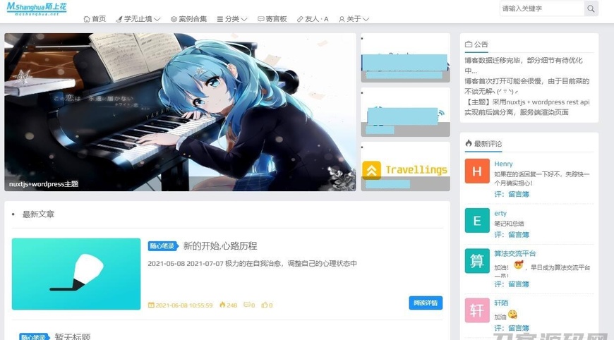 主题特色: 使用Nuxtjs + WordPress Rest Api 实现前后端分离,可完成多端部署; 主题支持自动切换黑夜模式。 service 目录为WordPress主题文件,需要拷贝到WordPress主题目录下,wp-content/themes 使用的时候请修改 nuxt.config.js 的配置项,改为自己的信息,修改注释的地方即可 修改 assets/scss/variable.scss 文件下的 $color-theme 变量,可以更换博客的主体风格