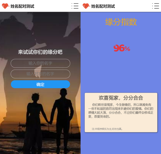 基于PHP+MYSQL开发制作的趣味测试网站源码。可在后台提前设置好缘分, 自己手动在数据库里修改数据,数据库里有就会优先查询数据库的信息, 没设置的话第一次查询缘分都是非常好的 95-99,第二次查就比较差 , 所以如果要你女朋友查询你的名字觉得很好 那就得是她第一反应是查和你的缘分, 如果查的是别人,那不好意思,第二个可能是你。 — 1秒登录查看完整内容 — QQ登录 账号登录