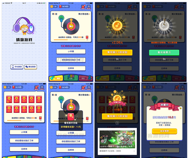 有奖猜歌游戏是一款基于uni-app、uniCloud、uniAD 开发的小游戏,通过猜歌曲、观看广告赚取现金奖励。 本游戏基本特征如下: 玩家可以通过猜歌、做任务等方式直接获取现金奖励 玩家可以通过猜歌、拆红包、做任务等方式获取金币奖励,当金币累积到一定数量可以兑换现金 玩家可以通过做带有抽奖字样的任务获取现金抽奖次数 现金抽奖次数可以通过大转盘获取不等额的现金 玩家每猜对一首歌曲,会显示连对,连续猜对会有更多奖励,并可以通过观看激励视频广告获取不同倍数的奖励 玩家猜错歌曲可以通过观看激励视频广告复活一次,否则连对奖励会重置,不能得到任何奖励 当达成一定条件玩家可以从游戏现金账户提现不等额的现金