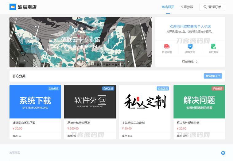 最新版波猫商店自动发卡售卡系统源码 适用于各种电商、优惠卷、论坛邀请码、充值卡、激活码、注册码、腾讯爱奇艺积分CDK等,支持手动和全自动发货,还有类似1688的分层批发模式。 功能特色: 开发语言:JAVA 开发框架:Spring boot 前端UI layui layui 开发的白天 – 黑夜 – 炫丽暗黑模板 基于Layui开发的炫丽后台界面 集成了后台多种主题模式 炫丽暗黑界面支持自定义背景图片 炫丽的前台卡片式商品展示 支持无限层级的批发模式 集成了微信订单消息通知以及邮件系统 支持自定义网站标题、关键字、logo、等 支持移动端支付宝唤醒APP支付 集成了大量支付接口【微信官方扫码、支付宝当面付、v免签、payjs、虎皮椒V3、YunGouOS、值联码支付、码支付、USDT、等…】 支持首页公告弹窗展示 集成了强大的优惠券系统 集成了自定义的商品购买备注字段
