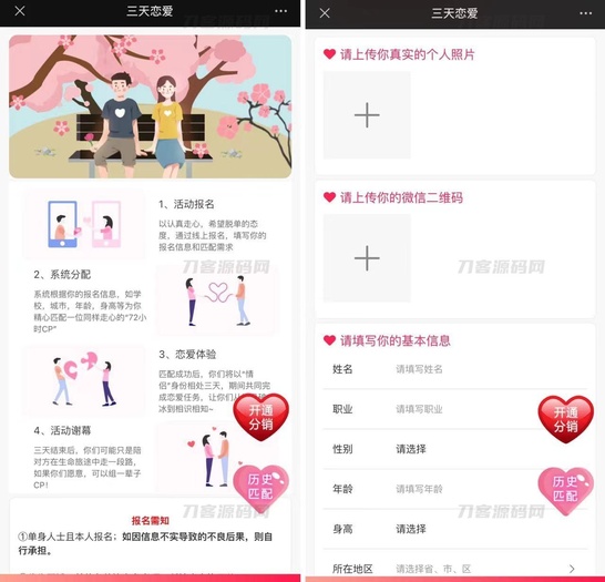 2023全新三天情侣系统源码H5版本 附搭建教程 最新脱离公众号版本,使用短信宝短信登入,支付对接易支付,方便接入,自动匹配成功,由短信通知 程序特色 1:可以设置男生收费,女生免费。(避免活动缺女孩) 2:需要认真填写资料,照片,城市。(也可以限制高校内部) 3:有独立的分销系统,19.9一单,分销利润50%,总部躺赚。 4:分销支持多海报生成,利于推广。 5:后台多种匹配方式,人多后,可支持自动匹配。 6:拉黑客户功能,避免垃圾人重复投资料。 7:系统自带投诉功能,更好的服务客户 8:后台统计,简单,清晰,功能齐全 盈利模式 1:客户提交资料配对的钱(匹配男女都收费) 2:代理开分销的门槛费(交了钱还给你千活,美滋滋 3:代理分销的抽成 (利润一般和代理五五开) 4:相亲流量和线下合作抽成(后台的资料,对接线下相亲,或者情感培训导师25元一个收粉) 5:高客单价:卖程序+培训(技术服务赚钱,培训教学赚钱)